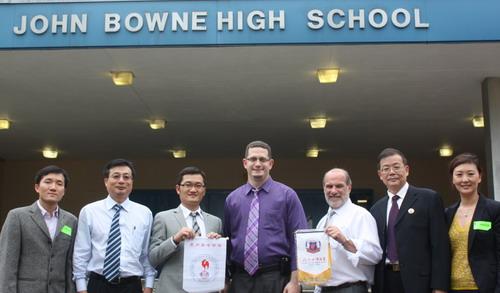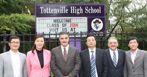 中國校長代表團27日起拜訪紐約多所高中,與美國中學校長座談,並參訪學校教育、俱樂部及校園,合影照片上圖左起為S.T.A.R. Early College School at Erasmus、John Bowne 高中;下圖左起為Tottenville 高中、St. Francis Preparatory School和High School of Economics and Finance。