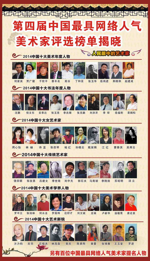 东南网2月11日讯(本网通讯员 纽约墨人)2015年2月10日,一年一度的 “中国最具网络人气美术家评选”活动成功落下帷幕,年度人物盛大揭晓。美国中国书法家协会主席李兆银入选“中国十大书法年度人物”。 据了解,中国最具网络人气美术家评选活动由中国东方美术家网、中国美术家与收藏家联谊会首度推出,主流网络媒体共同参与。从2010年开始至今,活动已成功举办四届,在美术界有着良好的口碑及影响力。第四届“中国最具网络人气美术家评选”活动紧扣“艺术中国梦”主题,历时9个月,通过网络、专家、媒体、短信及微博微信、评论点赞等大众喜闻乐见的投票方式,评选出了2014年度最受网民关注的美术人物。业界称之为“人民眼中的艺术家”。 据悉,本届活动除两岸三地参赛者外,海外华人华侨艺术家也纷纷响应,踊跃参赛。大赛最终从3万余名报名的参评者中,评选产生了2014中国十大美术年度人物、中国十大书法年度人物 、中国十大传统艺术家、中国十大女艺术家、中国十大美术学界人物、中国十大艺术新锐,以及百位中国最具网络人气美术家提名人物。 活动评选采取公平、公正、公开的原则,多项投票相结合,确保了大赛的权威性。尽管有些参赛人物在美术界已广为人知,但在公众层面却了解甚少,此次评选通过网络平台的互动,让更多网民走近并了解了艺术家,体现了艺术服务于大众的活动宗旨。 此外,大赛组委会还与国内50余家媒体建立了中国最具网络人气美术家媒体联盟,发动全国主流媒体共同传播优秀的文艺作品,传递“艺术中国梦”。 人物名片: 李兆银,字幼杏、号纽约墨人。1963年生于福建省连江县。先后毕业于“西安书学院”、“中国书画大学”、“中国书法家协会培训中心高研班”。曾拜书法名家潘主兰、胡子为为师。广泛接触各朝代的书法艺术,在艺术的海洋中,撷善择长,兼容并蓄,行成了其的作品古朴、苍劲、典雅、潇洒的艺术特色。2006年独创汉英书法,让中国文化与西方文化融合在一起,形成中美文化的新文人书法。2009年创办海外第一网站——美国书画网。2009年8月16日创办美国中国书法家协会〔American Chinese Calligrapher Association.INC〕,2012年9月16日成立纽约书法院New York Calligraphy)。 出版有《李兆银书画集》、《李兆银书法作品选集》、《中国书法家选集》、《中国书法家年鉴》、《当代中国著名书画篆刻家选集》、《世界名人录》、《世界优秀专家人才名典》等60多部作品。现为中国书画世界行美国纽约委员会主席、美东华人社团联合总会副主席、美国中国书法家协会主席、北兰亭美国分会会长、美国国际书法艺术中心主任、纽约书法院院长、杏花村书画院名誉院长。 |