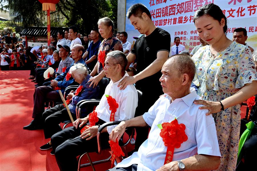 People give massage to the elderly during celebrations for the Chongyang Festival in Xijiao village of Xingtian township, Wuyishan city, East China's Fujian province, on Oct 7, 2019. A series of events were held on Monday to celebrate Chongyang Festival, which falls on the ninth day of the ninth Chinese lunar month, a day to pay respect to seniors in China. [Photo/Xinhua] |