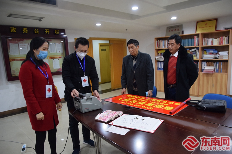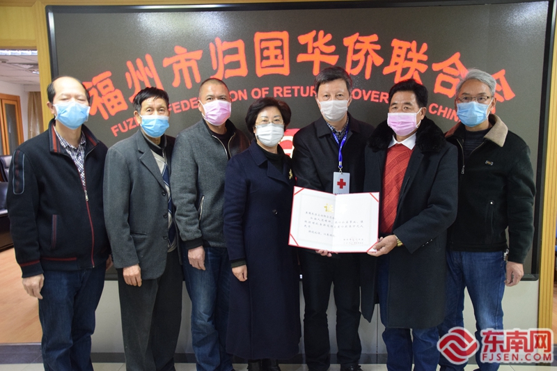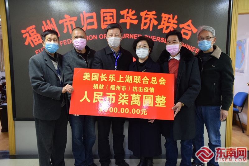 捐赠仪式现场。 东南网3月5日讯(本网记者 陈佳丽 文/图)3月5日下午,受美国长乐上湖联合总会会长王世钦的委托,4位来自福州市长乐区航城街道上湖村的村民代表来到福州市侨联,在侨联工作人员的见证下,将该村近百位旅美乡亲为支援家乡抗击新冠肺炎疫情捐赠的7万元善款,交到福州市红十字会工作人员手中。福州市侨联主席蓝桂兰、副主席李清华,市红十字会副会长胡树林参加捐赠仪式。 上湖村村民代表王玉林、郑秋官告诉记者,上湖村是长乐区航城街道联村村委会下辖的一个自然村,目前约有旅美乡亲150人。家乡发生疫情后,海外乡亲积极筹款捐物,为家乡抗击疫情做出贡献。