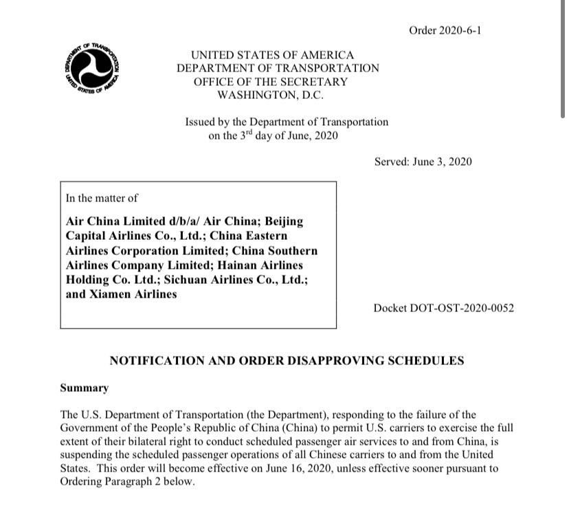 美国交通部:6月16日开始暂停往返中美的中国民航航班