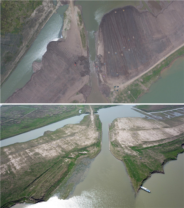 Combo photo shows engineering machinery creating a sluiceway after dismantling illegal fences on a shoal in the Dongting Lake in central China's Hunan Province (top, aerial photo taken on June 15, 2018 by Ding Chunyu), and the same sluiceway after its completion (bottom, aerial photo taken on March 12, 2019 by Chen Zeguo). Shen Guohua in Yonglian Village of Zhangjiagang, a county-level city in Jiangsu Province, also took the initiative to end his 44-year fishing life. He is currently employed by the local agricultural authorities as the captain of a patrol ship to contribute to the ecological protection of the Yangtze River. "The mother river has fed us for generations. Now it's time for us to repay," he said. |