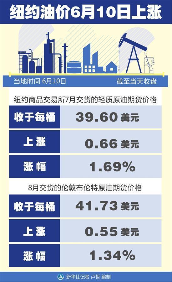 新华社纽约6月10日电(记者刘亚南)国际油价10日上涨。 截至当天收盘,纽约商品交易所7月交货的轻质原油期货价格上涨0.66美元,收于每桶39.60美元,涨幅为1.69%。8月交货的伦敦布伦特原油期货价格上涨0.55美元,收于每桶41.73美元,涨幅为1.34%。 美国能源信息局10日公布的数据显示,上周美国商业原油库存为5.381亿桶,环比增加了570万桶,而市场此前预计环比下降320万桶。