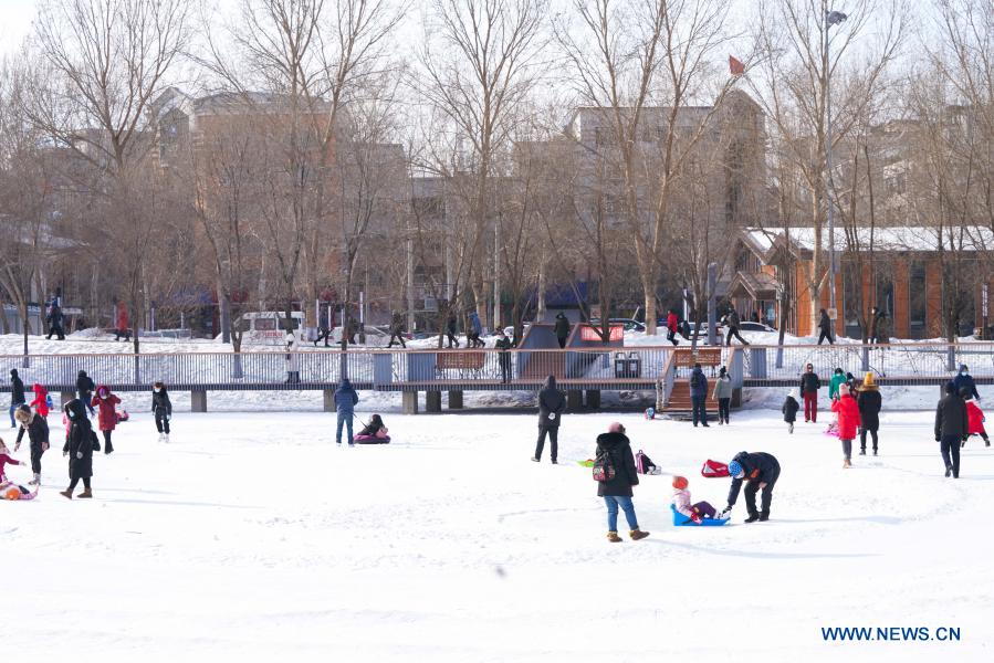 People have fun in the Xiangjiang Park in Harbin City of northeast China's Heilongjiang Province, Feb. 18, 2021. Yutian sub-district of the Limin development zone and Jianshelu sub-district of Hulan District, both in Harbin, have been downgraded to areas of low COVID-19 infection risk on Thursday. Harbin has so far cleared all areas with medium and high COVID-19 infection risks. (Xinhua/Wang Song) |