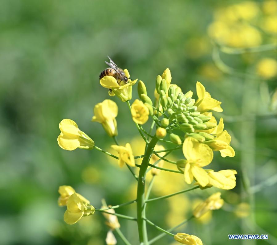 A bee sips honey from a cole flower in Zhuzhong Village of Minqing County, Fuzhou City, southeast China's Fujian Province, Feb. 19, 2021. (Xinhua/Song Weiwei)