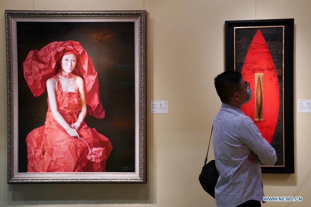 A visitor views an item of the China Guardian Hong Kong 2021 Spring Auctions at Hong Kong Convention and Exhibition Center in Hong Kong, south China, April 18, 2021. About 1,300 items are on offer at the China Guardian Hong Kong 2021 Spring Auctions which is open from April 18 to 23. (Xinhua/Li Gang) |